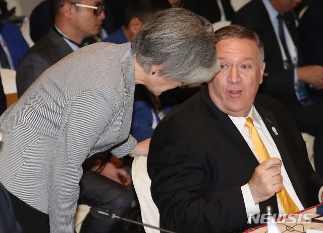 【방콕(태국)=뉴시스】최동준 기자 = 강경화 외교부 장관이 2일 오전(현지시간) 태국 방콕 센타라 그랜드호텔에서 열린 동아시아정상회의(EAS) 외교장관회의에서 마이크 폼페이오 미국 국무장관 자리로 찾아가 대화하고 있다. 2019.08.02.