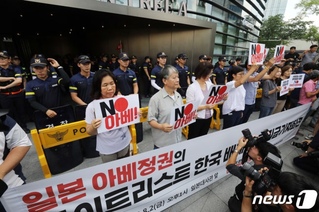 (서울=뉴스1) 이승배 기자 = 아베규탄 시민행동 회원들이 2일 오후 서울 종로구 일본대사관 앞에서 기자회견을 열고 화이트국가에서 한국을 배제한 일본 정부를 규탄하고 있다.
