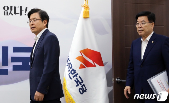 (서울=뉴스1) 이종덕 기자 = 황교안 자유한국당 대표가 8일 서울 여의도 국회에서 2020경제대전환위원회 자유로운 노동시장분과로 부터 보고를 받기위해 김광림 분과장과 함께 당 대표실로 들어서고 있다. 2019.8.8/뉴스1