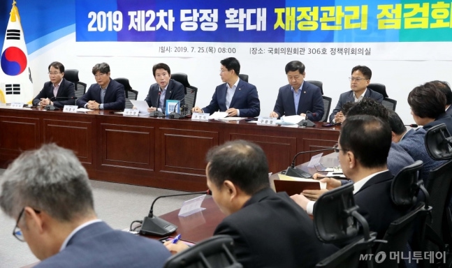 더불어민주당 이인영 원내대표가 25일 오전 서울 여의도 국회 의원회관에서 열린 2019 제2차 당정 확대 재정관리 점검회의에서 발언하고 있다.
