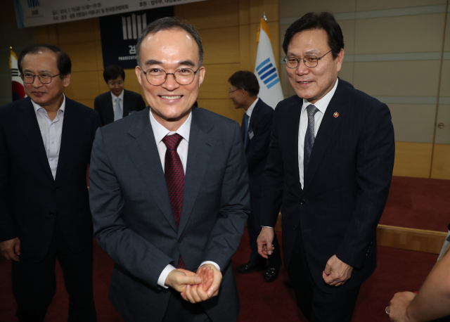 문무일 검찰총장(왼쪽)과 최종구 금융위원장이 19일 오후 서울 서초동 대검찰청에서 열린 '증권금융 전문검사 커뮤니티-한국증권법학회 제1회 공동 학술대회' 개회식을 마치고 자리를 떠나고 있다. 연합뉴스