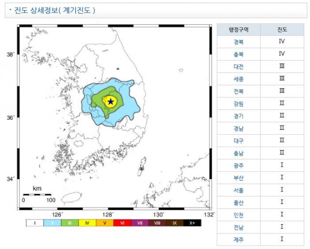 대전·세종·전북에서도 진도 3의 진동이 감지됐다. 진도 3은 실내, 특히 건물 위층에 있는 사람이 현저하게 느끼며 정지하고 있는 차가 약간 흔들리는 수준이다.