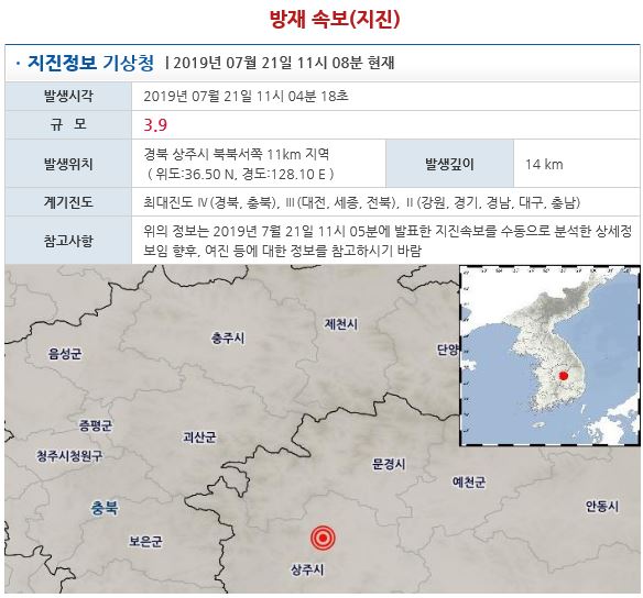 사진=기상청21일 오전 11시 4분경 경북 상주시 북북서쪽 11km 지역에서 규모 3.9의 지진이 발생했다.