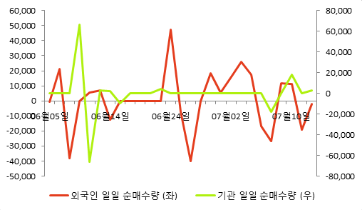 다음 표는 동종목의 외국인, 기관의 일별 순매수량을 나타낸 것이다.