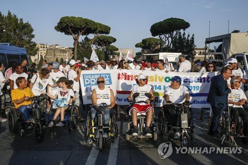 People on a wheelchairs participate in the Disability Pride Parade, in Rome, Italy, 14 July 2019. The parade has brought together voluntary activist work, protest and a collective celebration of diversity since 2013. EPA/FABIO FRUSTACI
